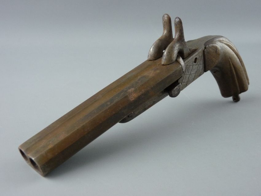 A SPANISH PIN FIRE DOUBLE BARRELLED PISTOL, barrel length 12 cms, total length 22 cms, some slight decorative markings to the metalwork, but no others