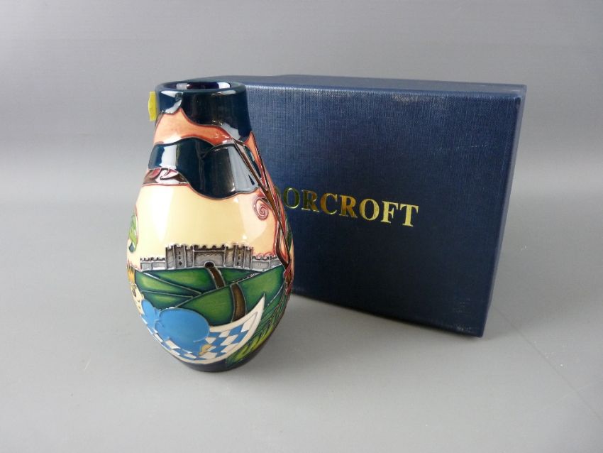 A MOORCROFT 'ANNA LILY' VASE, 8.25 cms high, designed by Nicola Slaney, decorated on a cream and cobalt blue ground, impressed factory mark and designer monogram, dated '98, (boxed)