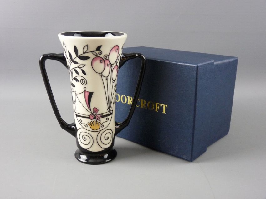 A MOORCROFT 'ROYAL JOY' TWIN HANDLED LOVING CUP, by Nicola Slaney, 15.5 cms high, impressed 'Moorcroft' with designer's signature and monogram to the base, dated 2014 (boxed)