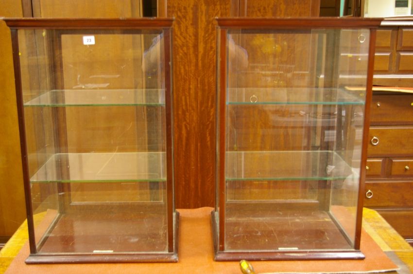 A PAIR OF VICTORIAN MAHOGANY DISPLAY CABINET by Rudduck & Co, Shopfitters, London, rear opening doors with brass fitting and interior glass shelves, 76.25 cms high, 48.75 cms wide, 39.5 cms deep