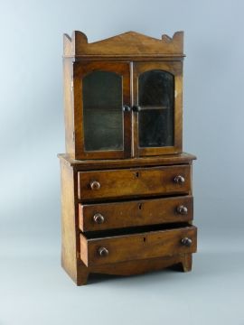 AN APPRENTICE PIECE MAHOGANY BOOKCASE CHEST having two upper glazed doors on a base of three long drawers with bracket style feet, 50 cms high, 27 cms wide and 13 cms deep