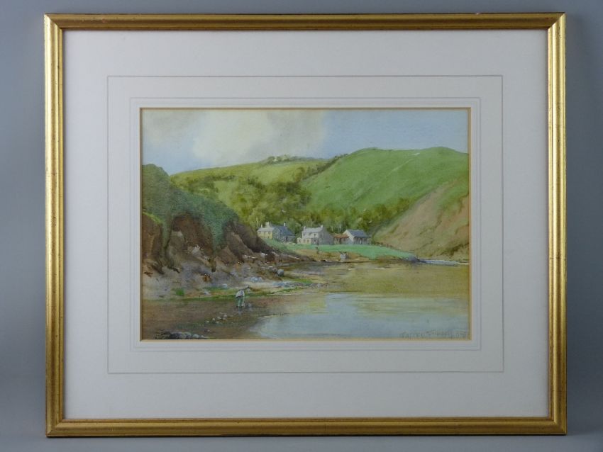 WARREN WILLIAMS ARCA watercolour - Llyn Peninsula(?), cove with buildings and bait gatherer by the water's edge, signed, 26 x 36 cms