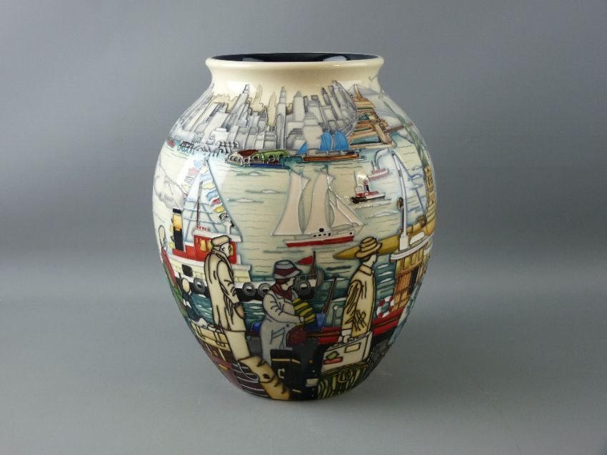 A MOORCROFT 'COMING TO AMERICA' VASE, designed by Paul Hilditch, decorated on an ivory ground with turquoise interior, impressed factory marks with designer's signature and monogram, dated 2014, limited edition no. 34, in original box, 26.5 cms high