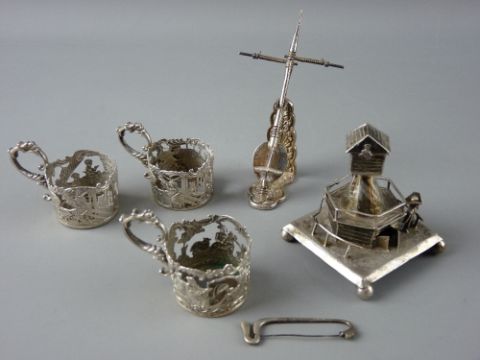 A GROUP OF SMALL SILVER including three small cup holders, stamped '800', a novelty instrument on stand, the stand marked '800' and the remnants of a model windmill, unmarked