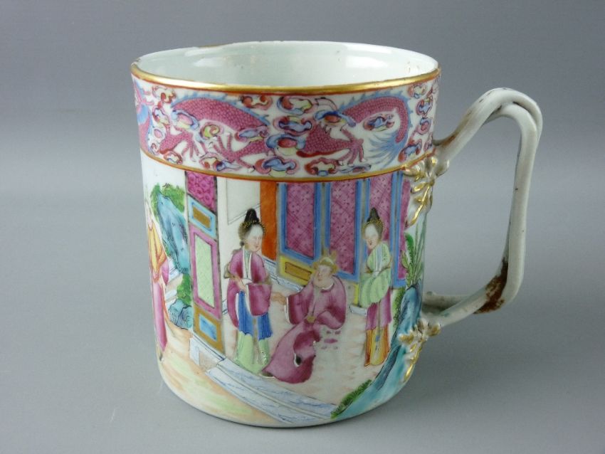 AN EARLY 19th CENTURY FAMILLE ROSE MUG, having a wide dragon decorated band to the top with eight figures depicted below and with a double strand claw handle, 12 cms high, 11 cms diameter (no cracks or chips but wear to gilded rims and handle)