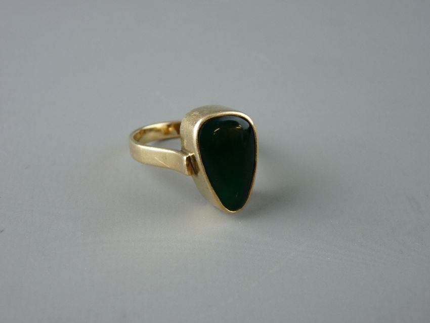 A NINE CARAT GOLD DRESS RING with diamond shaped green agate stone, 17 x 10 mm widest, size 'V', 7.6 grms