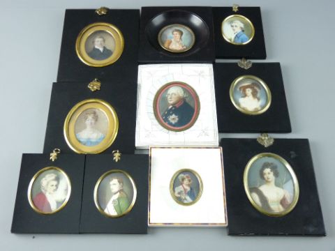 A COLLECTION OF 19th CENTURY & LATER HANDPAINTED PORTRAIT MINIATURES, ten in all, mostly head and shoulder studies of various gentlemen and ladies including Napoleon, all within various composition frames with metal loop hangers, seven having decorative mounts