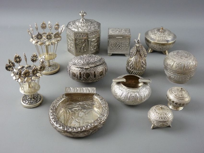 A QUANTITY OF EASTERN SILVER & WHITE METAL ITEMS including lidded pots and containers, two cocktail stick sets on stands and two ashtrays etc