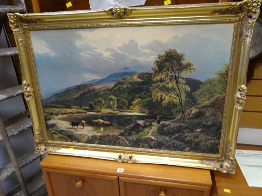 A framed print AFTER SIDNEY RICHARD PERCY, a Kenyan tourist antelope skin shield & a pair of spears