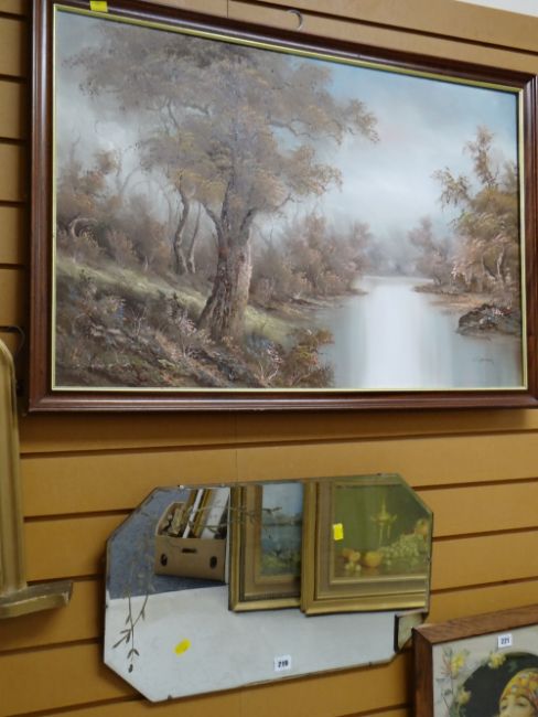 A framed oil on canvas woodland scene & a vintage mirror