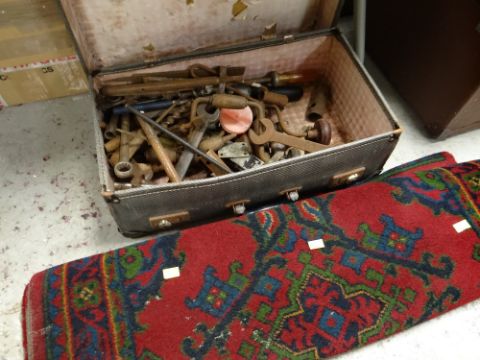 A suitcase containing vintage tools & a red, blue & green carpet runner