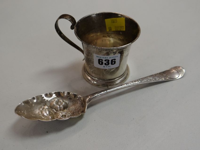 A Georgian silver berry spoon & a later silver Christening cup for Anne Quinlan
