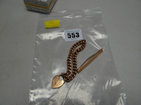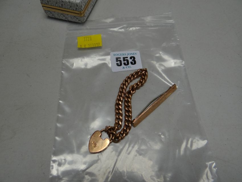 A 9ct yellow gold link bracelet with heart shaped padlock, 25.6gms together with an unmarked floral engraved bar brooch