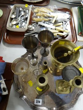 An EPNS circular tray, brass pestle & mortar, other metalware & tray of various flatware