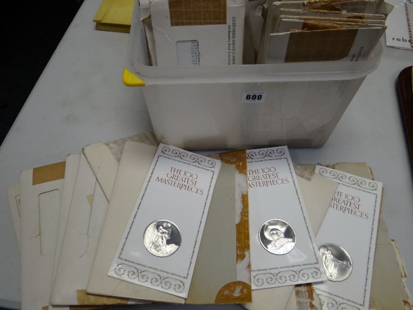 Approximately forty walleted John Pinches collectable silver medallions for 'The Hundred Greatest Masterpieces' together with a small collection of First Day cover stamps & coins etc