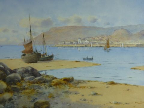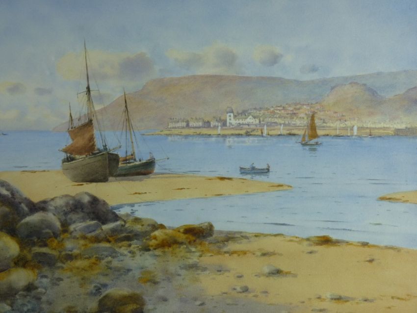 WARREN WILLIAMS ARCA watercolour - beached boats near Marine Walk, Conwy opposite Deganwy showing the old Harbour, The Castle Hotel and Great Orme in the background, signed, 32 x 49cms