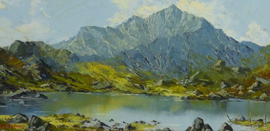 CHARLES WYATT WARREN oil on board - Snowdonia lake scene, signed in full and entitled label verso 'Snowdon from Llyn-y-Gadaer', 23.5 x 54 cms