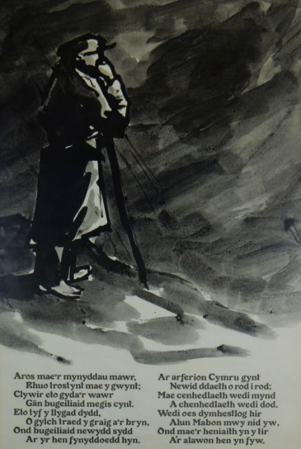 SIR KYFFIN WILLIAMS RA print - standing shepherd in stormy weather with poetry by John 'Ceiriog' Hughes (1832-1887), 'Aros Mae'r Mynyddau Mawr', a Welsh language poem regarding the enduring mountains standing through changing times, 72 x 48.5 cms