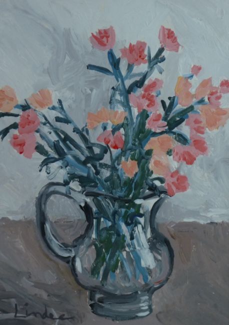 LAUREN LINDEE acrylic - still life, flowers in a jug, signed, 28 x 18cms