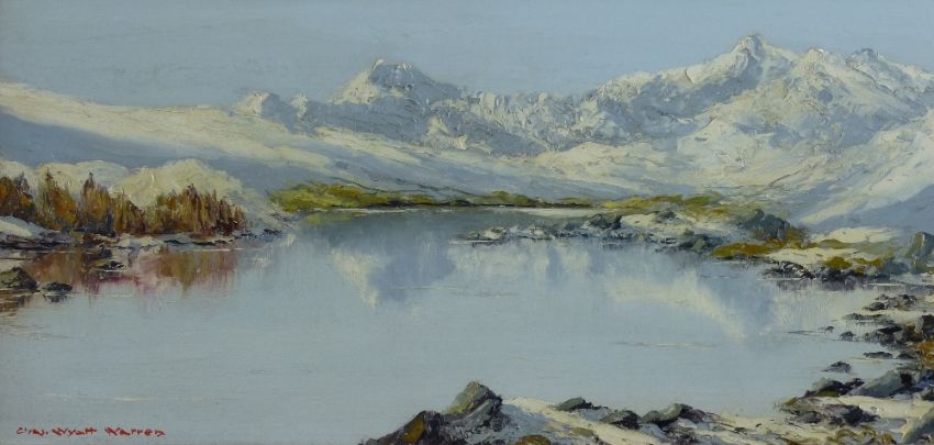 CHARLES WYATT WARREN oil on board - Llyn Mymbyr, Snowdon Horseshoe under snow, signed, 23 x 53cms
