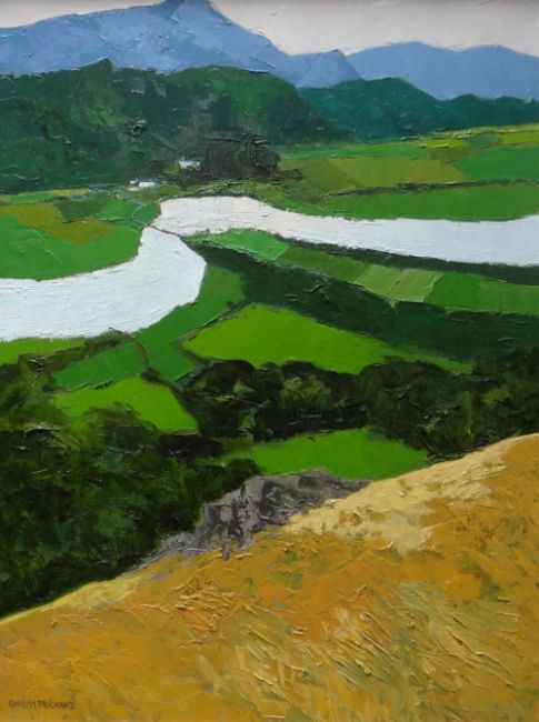 GWILYM PRICHARD oil on canvas - landscape with farmland, meandering river and mountains, signed, dated verso 1999, 70 x 51cms