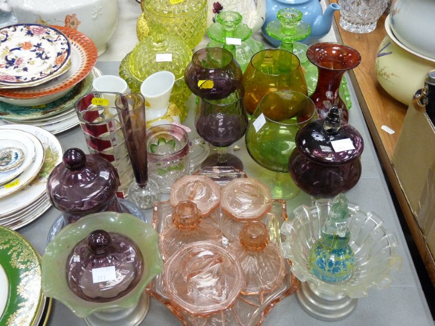 Large parcel of mixed glassware; dressing table items, milk glass vases etc
