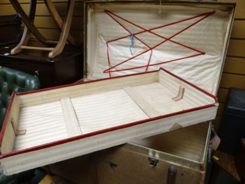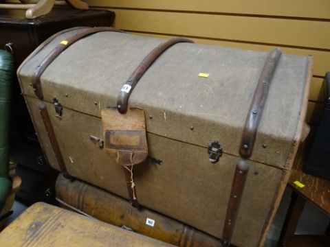 Vintage canvas dome top travel trunk with wooden banding together with an internal shelf