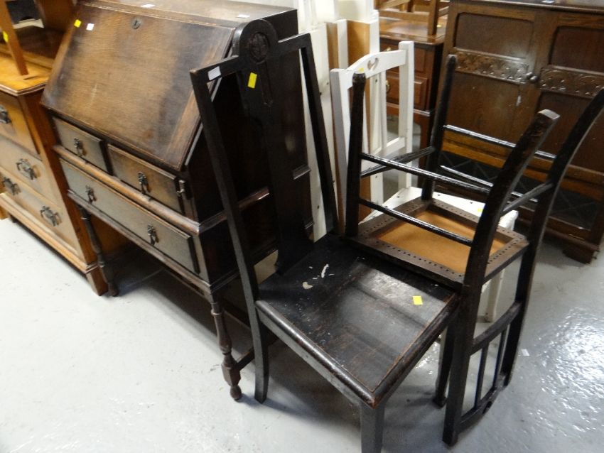 A vintage oak slope fronted bureau on raised legs together with three various wooden chairs