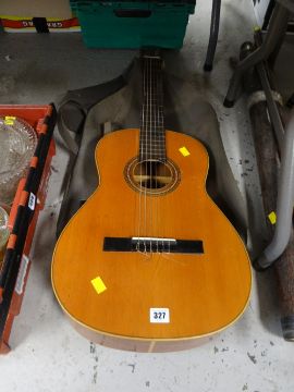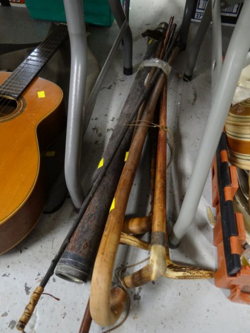 A Spanish acoustic guitar & sundry walking sticks, distressed telescope etc