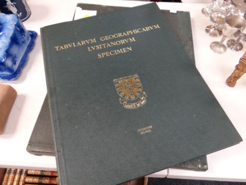 A gilt decorated wooden table easel & a parcel of unframed watercolours & prints together with a large reproduction of a sixteenth century atlas