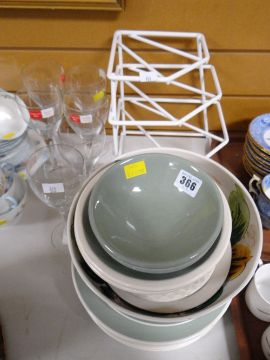 A parcel of kitchen pottery, set of six wine glasses & a crockery stand