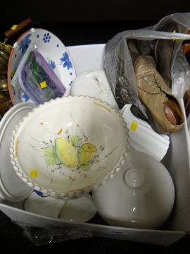 Box containing various kitchen china including cheese dome, covered dishes etc