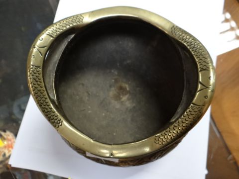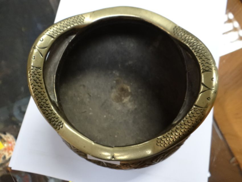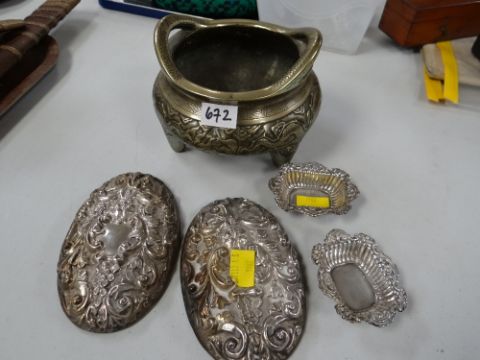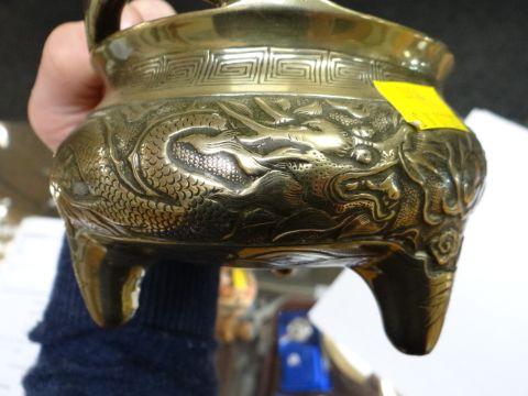 A polished bronze Chinese twin-handled censer, relief decorated with circling dragons together with a parcel of silver & an Imari onion-shaped vase