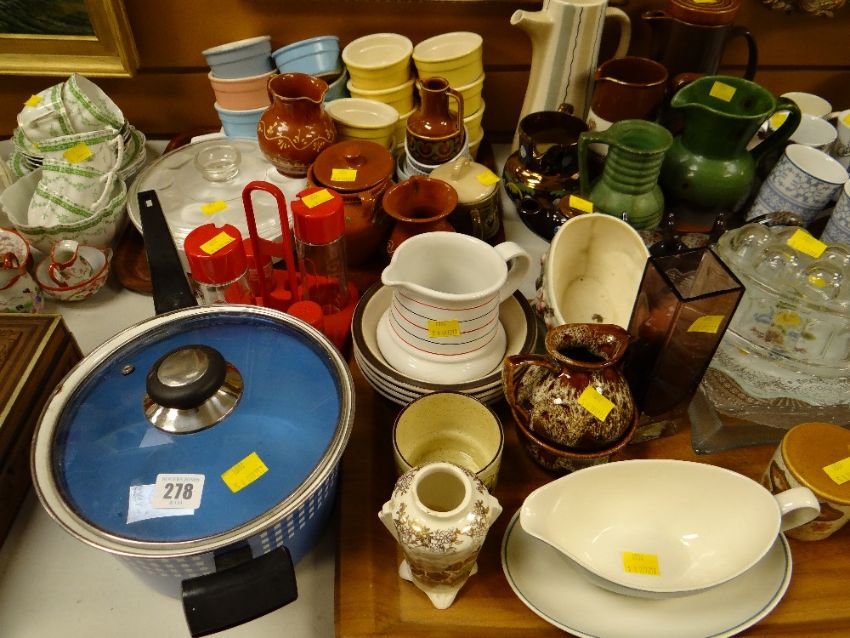 A quantity of mixed kitchen pottery, glassware, saucepans etc