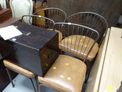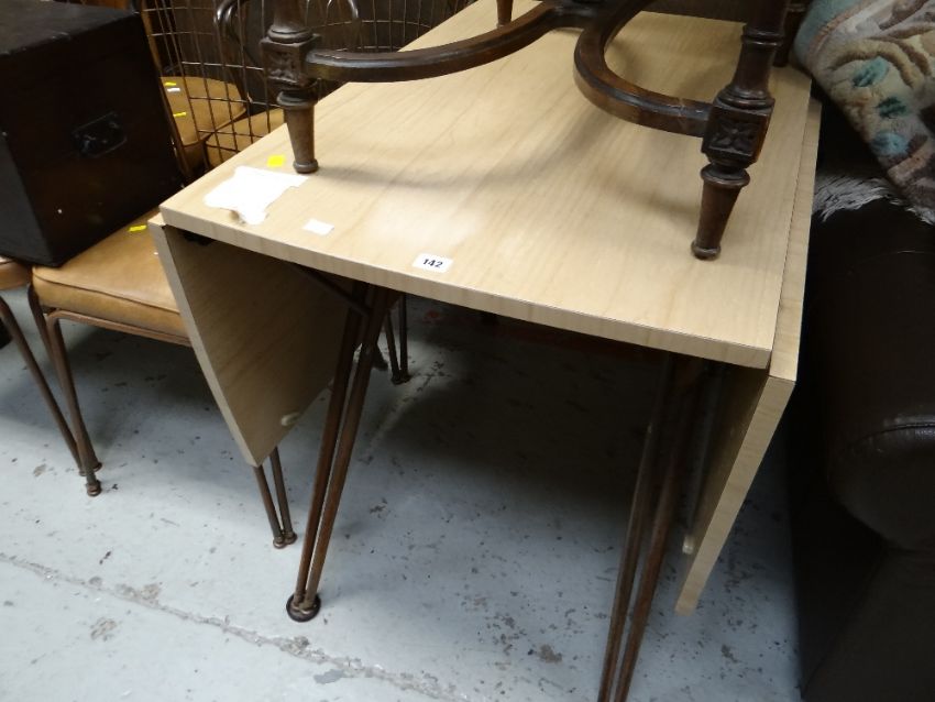 A retro-cool American Daystrom Formica topped drop leaf with twin metal legs table together with four matching chairs having metal mesh backs, two straight & two bucket