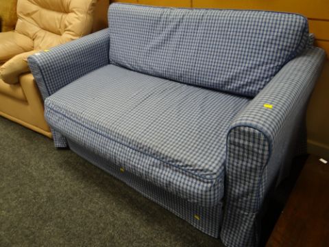 A blue checkered patterned bed settee