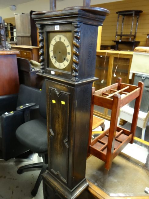 A vintage dark oak grandmother clock (distressed) together with a pair of wooden smoker's companions
