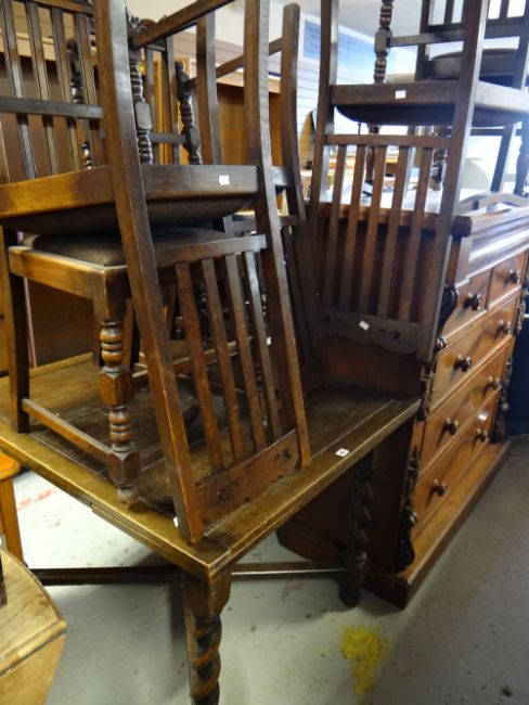A vintage oak pullout extending dining table with barley-twist cross stretcher base together with six matching high back dining chairs (1 carver + 5)