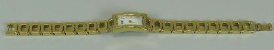 A MODERN YELLOW METAL ROTARY LADIES WATCH with geometric linked bracelet and curved white dial with a surround of possible diamonds