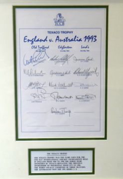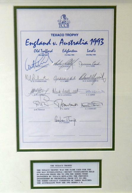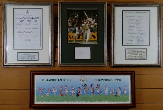 A PARCEL OF SIGNED FRAMED CRICKET ITEMS included are a signed photograph of Ian Botham, a fully signed framed England team sheet tour of Australia 1979-1980, a fully signed England vs Australia 1993 team sheet and a framed Gren print No 144/300 of Glamorgan's championship signed by all the players