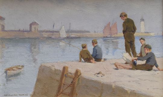 FARQUHAR McGILLIVRAY KNOWLES (1859-1932) oil on panel - group of boys fishing and lazing on a harbour wall, signed and indistinctly dated, possibly '94 (1894), 14 x 22cms
