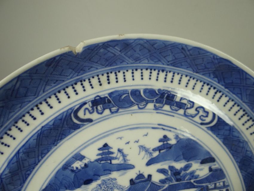 THREE NINETEENTH CENTURY CHINESE BLUE & WHITE PLATES one with character marks (some damage)