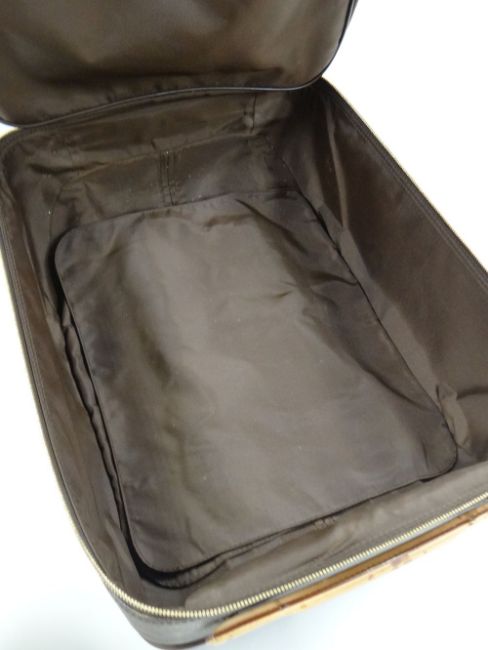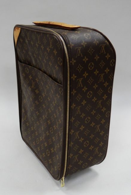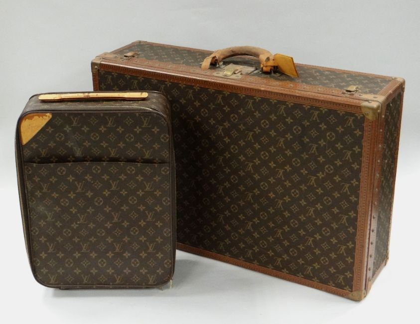 LATE TWENTIETH CENTURY LOUIS VUITTON SUITCASE in the typical logo & floral motif design, having a leather handle & luggage tag, interior with lift out shelf, internal label serial number 948532, 75 x 50cms deep, together with a small Louis Vuitton 'flight case' (missing telescopic handle)