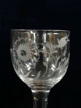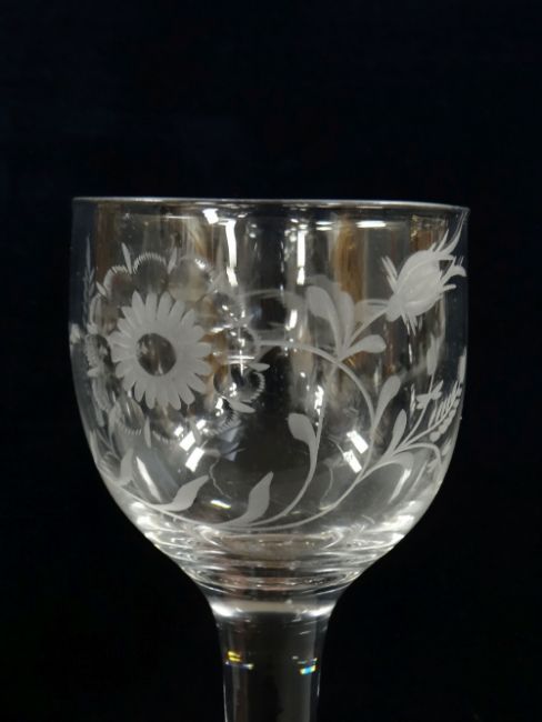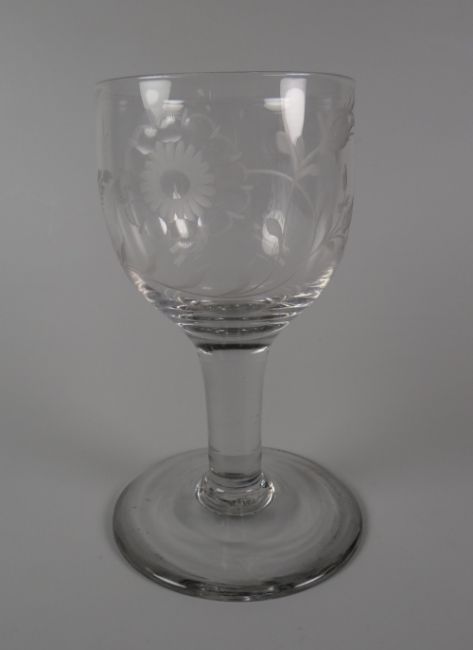 AN MID-EIGHTEENTH CENTURY GLASS GOBLET having an ovoid bowl etched with Jacobite emblems of rose, bird and grasses, raised over clear stem with slightly conical spreading foot, circa 1750, 16cms high
