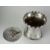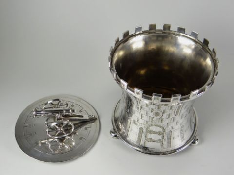 AN EPNS NOVELTY 'CASTLE & TURRET' BISCUIT BARREL in the form of a a waisted castle turret with engraved architectural detail and having a cannon mounted lid, circular based on three bun feet, 20cms high
