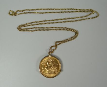 A 1965 GOLD FULL SOVEREIGN on a fine 9ct yellow gold necklace, total weight 13.8gms