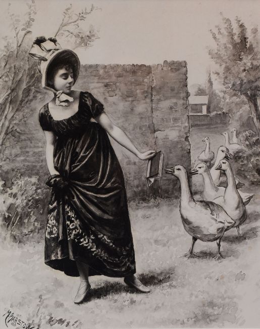 MONTAGU BARSTOW ink wash - young lady with bonnet & dress being chased by a gaggle of geese, signed, 27 x 21.5cms