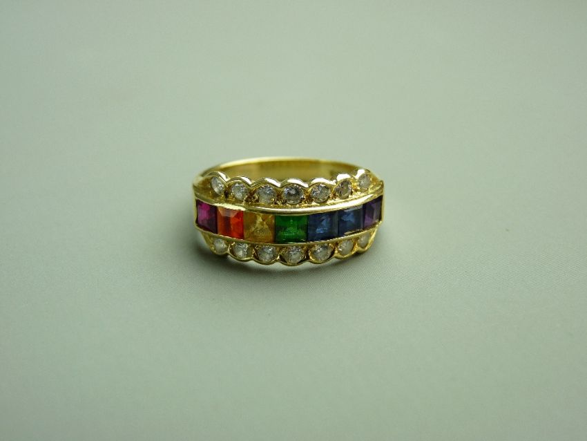 A FINE EIGHTEEN CARAT GOLD RAINBOW GEMSTONE & DIAMOND HALF HOOP DRESS RING having seven mixed square faceted stones - amethyst, citrine, topaz, emerald, sapphire and tanzanite etc and with an outer row top and bottom of seven small diamonds each, of visual estimate 0.5ct, total 4.9gms gross