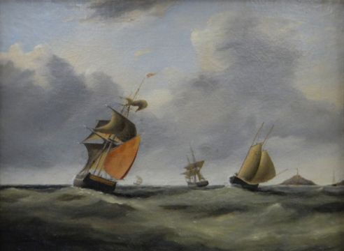 HENRY BIRCHALL oil on canvas, ships in full sail with Mumbles lighthouse in backround entitled verso 'Shipping in Swansea Bay', signed, 44 x 58cms