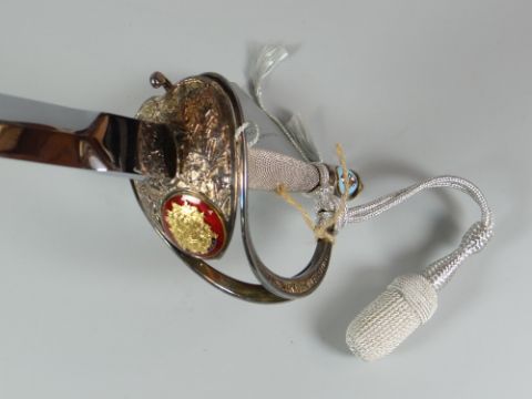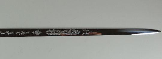 A 1981 WILKINSON COMMEMORATIVE SWORD for the wedding of Prince Charles and Lady Diana with inscription to the blade and the handle with three enamel coat-of-arms for Prince Charles, the Spencer Family and The Prince of Wales, includes information card